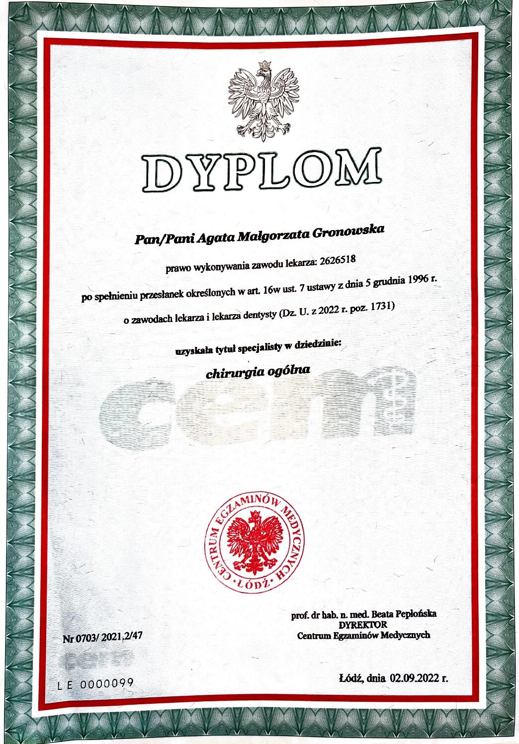 Nazywam się Agata Gronowska – jestem specjalistą chirurgii ogólnej z wieloletnim doświadczeniem klinicznym.